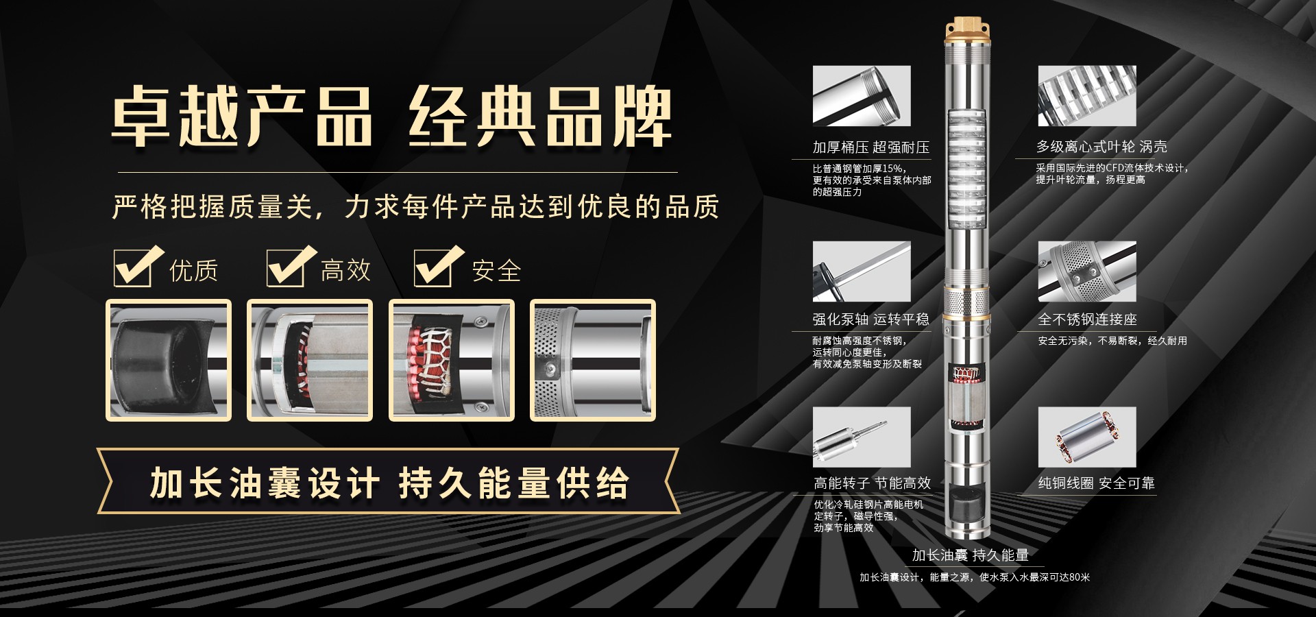 不僅僅是泵,更是流動(dòng)的科技。十多年來(lái),本公司堅(jiān)持走:以質(zhì)量求生存以科技創(chuàng)新求發(fā)展,重合同守信用的道路,生產(chǎn)經(jīng)營(yíng)得到迅速發(fā)展。更希望以后不管從發(fā)達(dá)城市到新農(nóng)村,從工業(yè)制造到尖端科技產(chǎn)業(yè)都隨處可見(jiàn)創(chuàng)江井泵的身影,創(chuàng)江深井泵已成為干萬(wàn)用戶(hù)心目中優(yōu)質(zhì)和信心的保證我們將以?xún)?yōu)質(zhì)的產(chǎn)品和最完善的售后服務(wù)來(lái)真誠(chéng)與各界朋友開(kāi)展廣泛的合作,共同創(chuàng)造一個(gè)美好的未來(lái)!